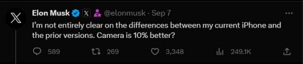 ▲ 图源 X 平台相关贴文不过IT之家发现,马斯克在几天前还在评价苹果 iPhone 15 缺乏创新,本月较早时,一位 X 平台用户发帖称:“苹果会年复一年地推出同样的 iPhone,而人们仍然会失去理智。”马斯克回应称:“我不太清楚我现在的 iPhone 和之前的版本有什么不同。相机好了 10%?”