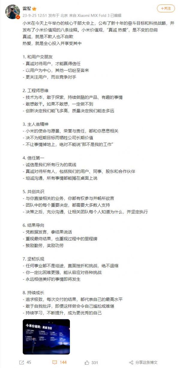 IT之家 9 月 25 日消息,小米创办人,董事长兼 CEO 雷军今日午间发文,小米在今天上午举办的核心干部大会上,公布了新十年的奋斗目标和科技战略,并发布了小米价值观的八条诠释。