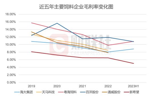 注:通威股份、天马科技未公布2023年上半年饲料板块毛利率,故图中未收录(数据来源:公司年报、半年报 财联社记者整理)