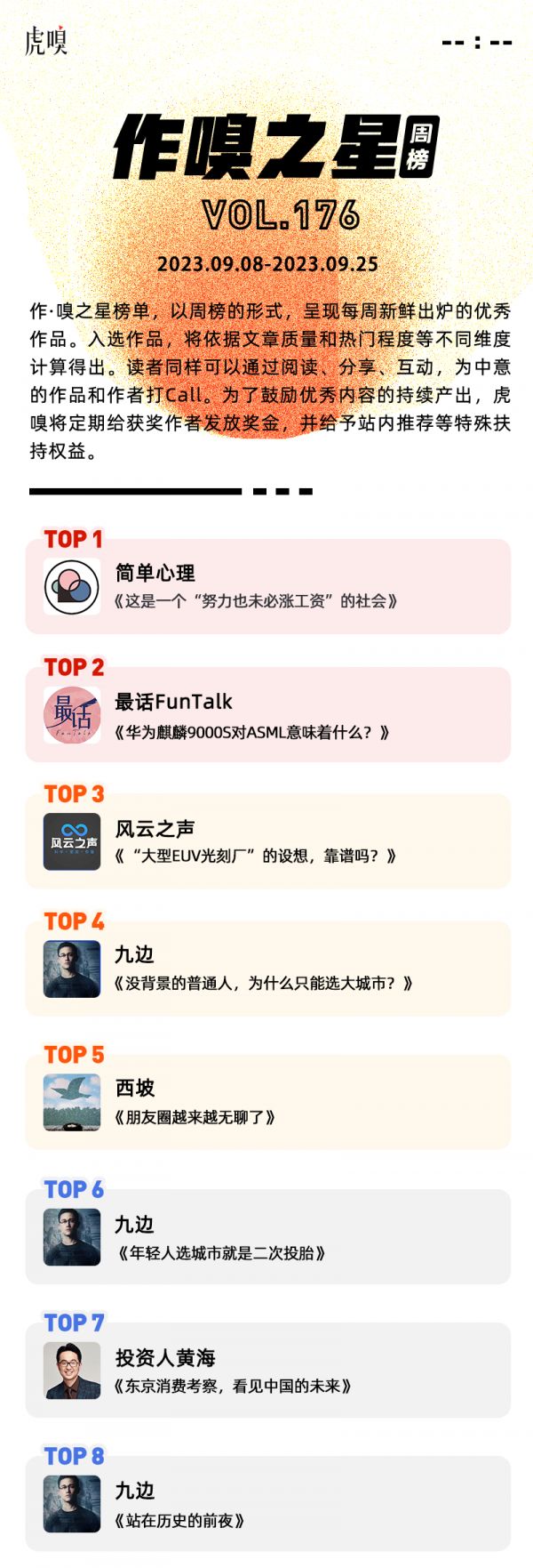 作·嗅之星榜单,以周榜的形式,呈现每周新鲜出炉的优秀作品。2023年9月8日~2023年9月25日,虎嗅第176期作·嗅之星的获奖文章分别是: