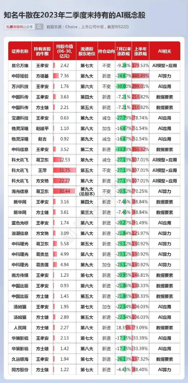 “牛散”持有的多只AI概念股在9月22日涨停或大涨。如王孝安持有的昆仑万维实现20%涨停板,“章盟主”的岳父方德基持有的中际旭创涨超14%。
