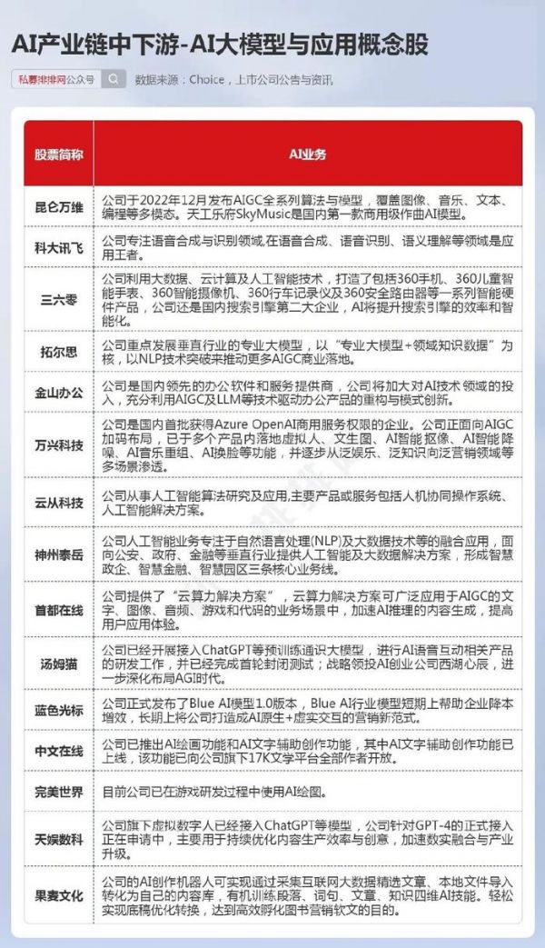 AI产业链包括上游的AI算力、数据要素,中游的AI大模型,下游的AI应用,涉及众多公司,笔者整理出了部分AI概念股供大家参考。
