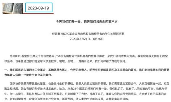 此外,ICPC(国际大学生程序设计竞赛)官网9月19日发布了任正非与ICPC相关人士的谈话纪要。