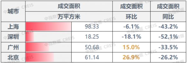 △ 一线城市成交面积同环比情况,图源:中指研究院