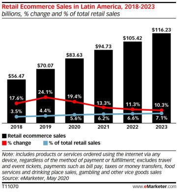 据INEGI在今年年初的预测,2023年,巴西、墨西哥和阿根廷等拉美国家的线上零售额将达到1290亿美元,整个拉美的电商增速达到15.4%,高出全球平均增速近50%。