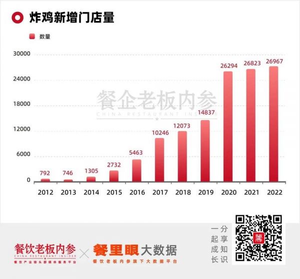 企查查数据显示,炸鸡2022年我国有关键词为炸鸡的现存企业16.41万家。从年注册量来看,自2015年开始,新增炸鸡企业也以成倍的数量增长,2021~2022年,均有2万多家企业加入炸鸡赛道,规模在不断扩大。