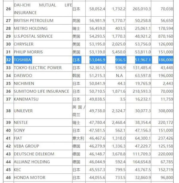 在1996年的世界财富500强榜单中,东芝以530亿美元的营收,高居第32位。