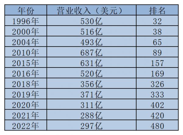 2022年,东芝营业收入为297亿美元,排名下跌至480位。