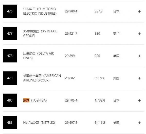 营业收入降低,导致东芝在财富500强榜单的排名也持续下滑。