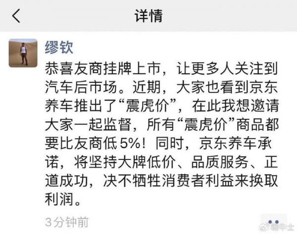 京东集团副总裁、京东零售汽车事业部总裁缪钦在朋友圈发文祝(阴阳)贺(阳)途虎上市,同时还宣布京东养车所有震虎价商品都要比友商低5%。