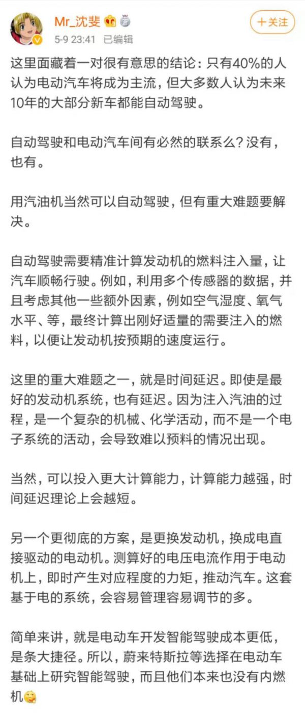 今年5月,蔚来能源副总裁沈斐在微博上分享过一个观点,他认为油车可以实现自动驾驶,但要解决时延问题,必须要投入更大的计算能力,相比之下,将内燃机换成电动机,开发智能驾驶的成本更低,是一条更可取的捷径。