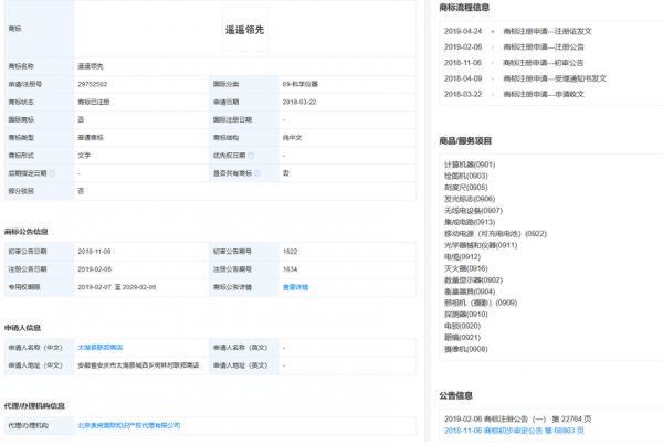 (第9类“遥遥领先”商标信息)
