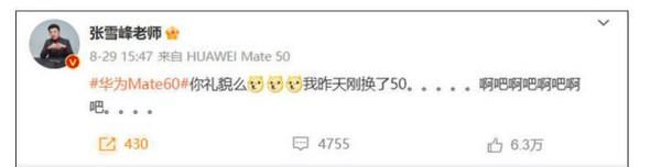 自此华为Mate60系列问世之后,张雪峰就多次被华为“背刺”。8月29日,华为直接上架了华为Mate60 Pro,当时,张雪峰刚刚换下了自己使用了五年的华为Mate20旧手机,换上了一台Mate50。结果新手机才上手一天,华为Mate60 Pro就直接问世,张雪峰当即没绷住:“华为Mate60你礼貌么,我昨天刚换了50。。。。。啊吧啊吧啊吧啊吧。。。。”