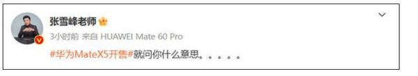 然而,当张雪峰用上华为Mate60 Pro 之后仅仅四天,华为再度通过先锋计划开售了华为Mate60 Pro+和华为Mate X5,来了个“背刺二连击”。当天,张雪峰老师转发了华为Mate X5开售的消息,同时吐槽:“就问你什么意思。。。。。”