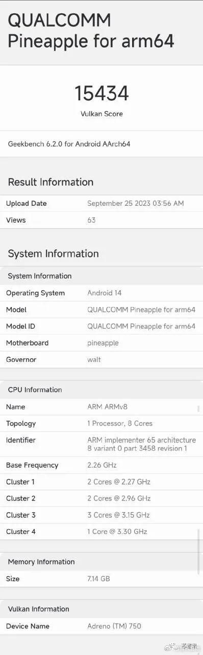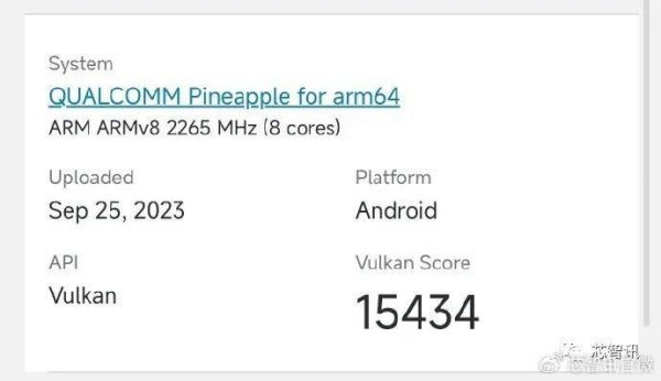 另外最新曝光的骁龙8 Gen 3工程样机的Geekbench 6 Vulkan测试结果也被曝光,得分为15434分,相比骁龙8 Gen2的10447分,大幅提升了47.7%。