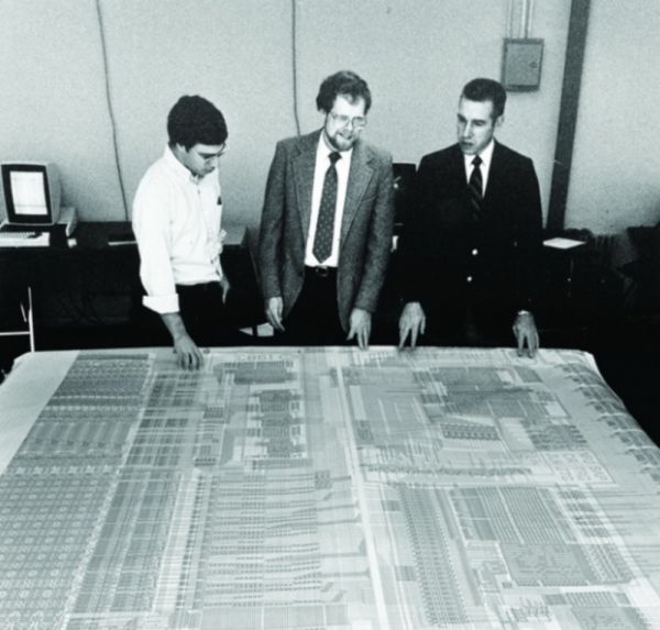 John Hennessy(中)检查MIPS R2000的布局,1986年 图片来自:Chuck Painter / Stanford News Service