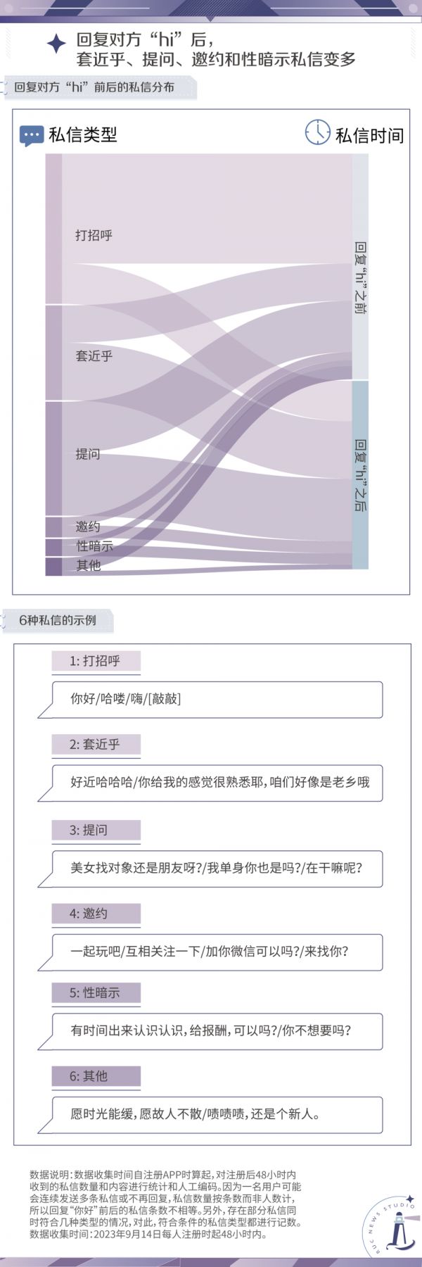 考虑到伦理问题和对实验者的保护,实验者不主动匹配、聊天,只对前来私信者回复一次“hi”,对话仅限于一个来回。可以发现,在回复之后,套近乎、提问、邀约和性暗示的私信显著增多了。