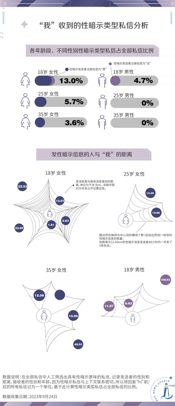 设定为18岁女性的实验者收到的私信中,13%都包含了性暗示。对比其他组别,这些私信者们更为狂热,在发现目标后喜欢“连续进攻”。最多的一位孜孜不倦地发送了12条性暗示信息。而“我”只是说了一声hi。