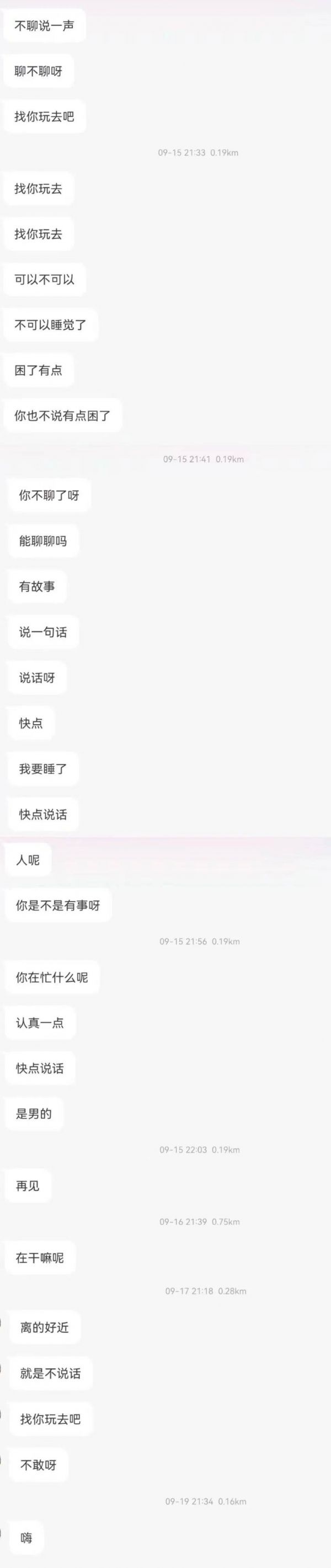 而最邻近的一位私信者,与我的最小直线距离只有0.16km。他的信息并不包含明显的性骚扰,只是持之以恒地“自说自话”。