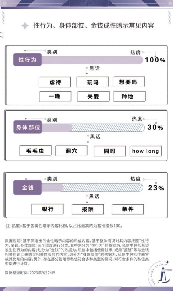 有41%包含性暗示的消息来自于say hi 之前,这些私信者在“我”未发一言时就开门见山地抛出了需求:“可以当您的狗吗?”“回下我啊~你不想要吗?”“给你银行里的东西一起玩一玩”——他们了解平台的审核机制,知道需要规避“钱”这样的字眼。