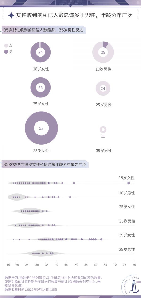 在我们的实验中,18岁女性收到的私信条数最多(140条),而吸引私信者最多的是35岁女性(53人)。相对于其他人设,这两个组别的私信者年龄分布最为平均,且跨度最大。在18岁女性的私信者中,最高龄的77岁。