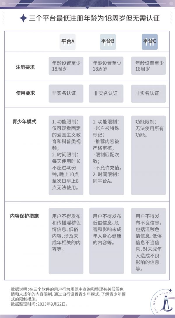 三个明面上只服务于成年人的平台,却又都设置了青少年模式。而更吊诡的是青少年模式的触发模式:交友软件A和C都是用户自愿开启,而B需要通过身份证和人脸识别认证为“18周岁以下”才能开启。