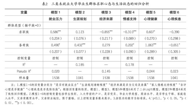 本文第四部分已经通过描述性分析比较了三类未就业大学毕业生典型群体的求职心态与生活状态的差异,本部分我们通过纳入更多的影响变量,进一步通过回归模型对描述性分析的结果进行检验。