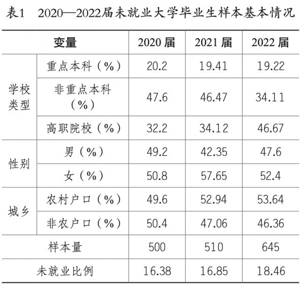根据本研究的需要,我们使用了PSCUS2020年、2021年和2022年毕业生数据库中应届毕业生(包括高职院校毕业生和本科院校毕业生)的相关调查数据,并确定其中未就业应届毕业生作为研究对象,PSCUS每年对于毕业生的调查时点为11~12月,因此此时应届毕业生的就业选择和就业状况已经相对稳固,可以更好地考察他们的就业心态和生活状态。