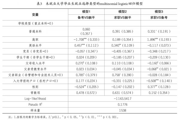 模型3显示,在求职和备考两种选择之间,重点本科的未就业大学毕业生更倾向于选择后者,普通本科和高职院校的未就业大学毕业生会更倾向于选择前者。家庭背景更好的未就业大学毕业生会更倾向于选择备考,男大学毕业生更倾向于继续求职,女大学毕业生更倾向于继续备考。