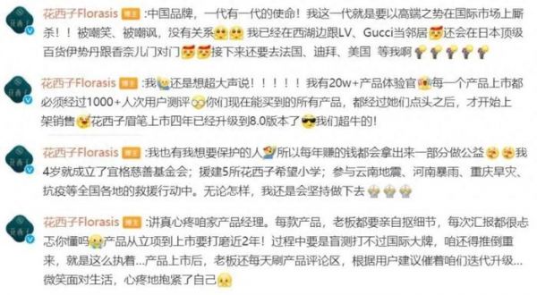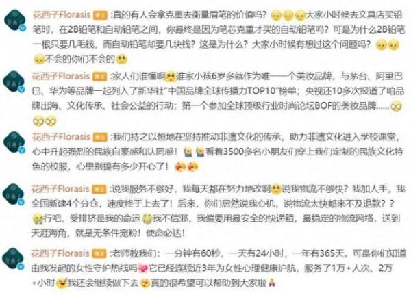 与此同时,花西子还一连串发布至少九条评论,涉及捐赠、价格、质量把控等内容。