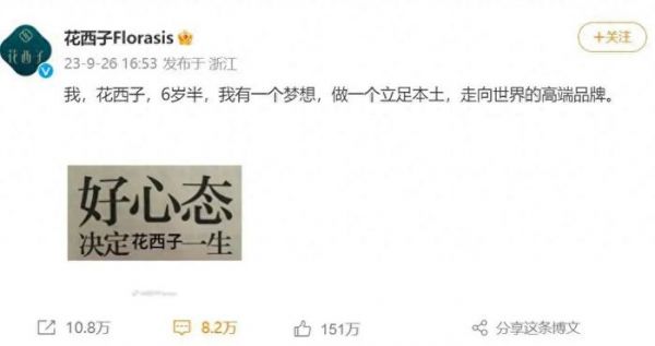 下午5点左右,在临近下班的时间点,因“李佳琦事件”而处于舆论中央的花西子,在官微发布了一条消息,“我,花西子,6岁半,我有一个梦想,做一个立足本土,走向世界的高端品牌”,并配上一张带有文字的图片,“好心态决定花西子一生”。