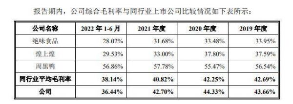 从综合毛利率来看,德州扒鸡2019年~2022年上半年毛利率分布为43.66%、44.33%、42.7%和36.44%;虽低于周黑鸭,但高于同期的绝味食品和煌上煌,甚至比同行平均毛利率水平还要高。