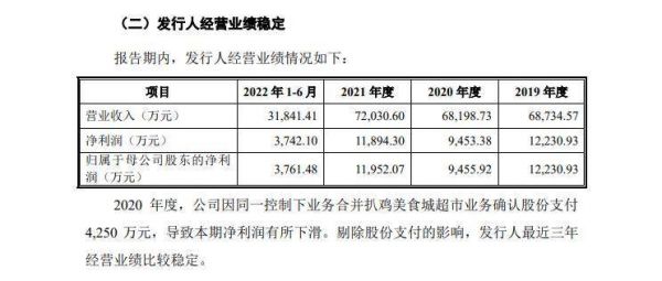 据其最新披露招股书显示,2019年~2022年上半年,德州扒鸡分别实现营收6.87亿元、6.82亿元、7.2亿元和3.18亿元;净利润分别为1.22亿元、0.95亿元、1.19亿元和0.37亿元。