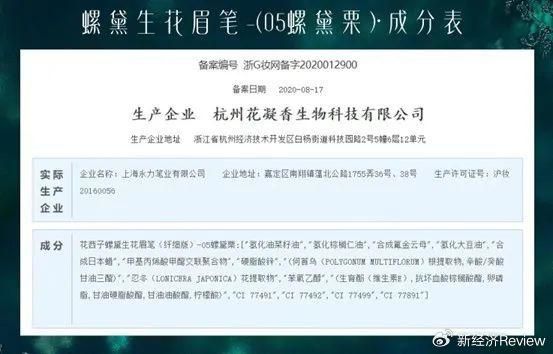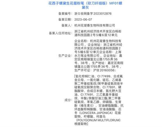 不过,查询花西子眉笔的备案信息后我们发现,其区别与其他眉笔的主要成分,集中在忍冬花提取物、何首乌根提取物等中药材上,与“螺子黛”眉料的相关传闻并无太大干系。