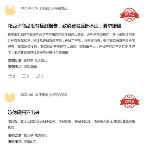 在黑猫投诉平台上,花西子累计投诉数量已达近百起,包括“产品过期”、“用后过敏”、“防伪码扫不出来”等问题层出不穷,涉及眉笔、口红、散粉等品牌旗下多款热销产品。