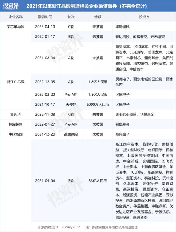 投资界根据公开数据不完全统计,浙江晶圆制造相关企业融资事件累计达8起,其中不乏一批生力军逐步成长为行业中坚力量。