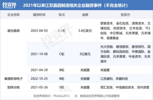 集成电路最强地级市无锡所处的江苏省也毫不逊色。投资界根据公开数据不完全统计,江苏晶圆制造相关企业融资事件累计达19起。