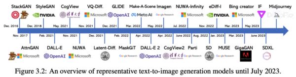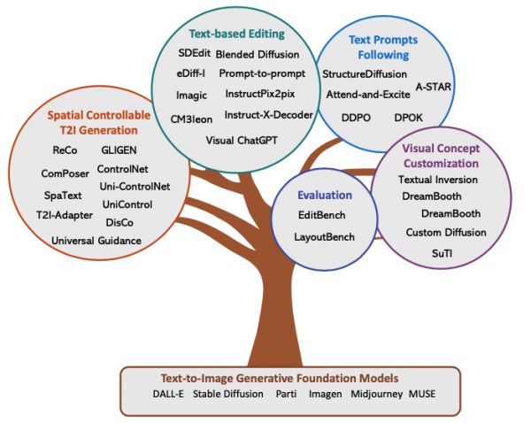 在视觉生成模型章节中,该研究详细介绍了与调整 T2I 模型以更准确地与人类意图保持一致相关的文献。其中包括增强空间可控性、编辑现有图像以改善对齐、更有效地遵循文本提示,以及为新的视觉概念个性化 T2I 模型。