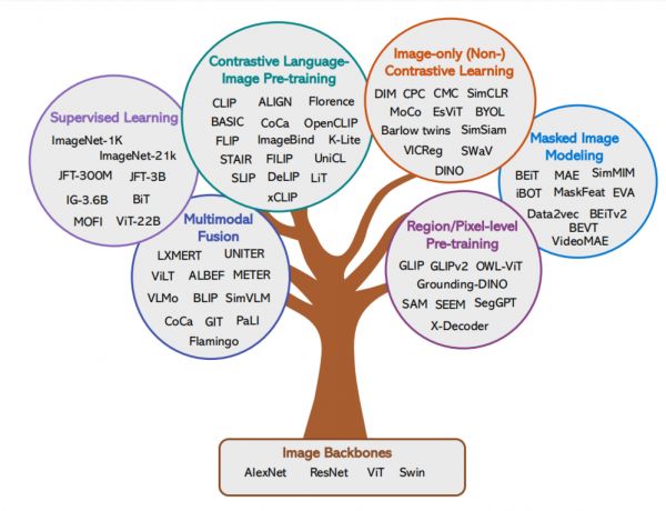 在视觉理解模型章节中,该研究首先讨论了监督学习和 CLIP,随后转向仅图像的自监督学习,其中包括对比学习、非对比学习以及掩膜图像建模。接着,研究又探讨了增强多模态融合、区域级和像素级图像理解的预训练方法。