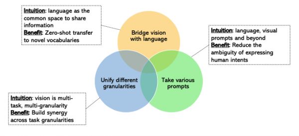 不同的视觉任务涉及各种不同类型的输入,包括图像、视频以及视觉与语言等多模态输入。不同任务还需要不同的粒度,如图像级别、区域级别和像素级别的任务。这导致视觉系统的输出具有不同的格式,包括空间信息和语义信息。