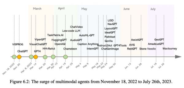 另外,研究还回顾了有关将不同的多模态专家与 LLMs 相结合以解决复杂多模态理解问题的文献,其中涵盖建模范式的演变,多模态代理的概述以及如何构建多模态代理的详细内容。