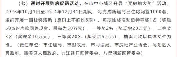 根据新政,将在九江市中心城区开展“买房抽大奖”活动,2023年10月1日至2024年12月31日期间,每完成新建商品住房网签1000套,组织开展一期抽奖活动,原则上不超过6期。