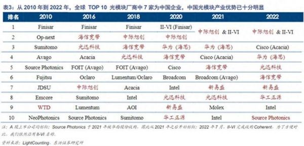 2010年,全球前十大光模块厂商中,仅有光迅科技(002281)一家中国企业(即下表中的WTD,后与光迅科技合并)。