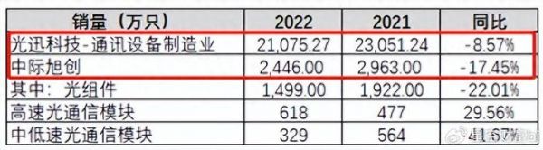 2022年,虽然中际旭创和光迅科技营收分别同比增长25.29%、6.56%,但实则,销量已分别同比-17.45%、-8.57%。