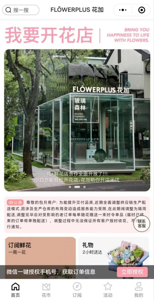 花加是国内最早创建鲜花订阅服务平台,成立于2013年,采用线上预定,线下专人配送的方式,并推出保鲜液、花剪、花瓶等周边产品。