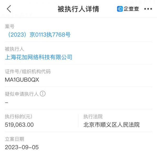企查查资料显示,花加的主体公司上海花加网络科技有限公司在今年9月5日被申请强制执行,已成被执行人,执行金额约52万元,执行法院为北京市顺义区人民法院。