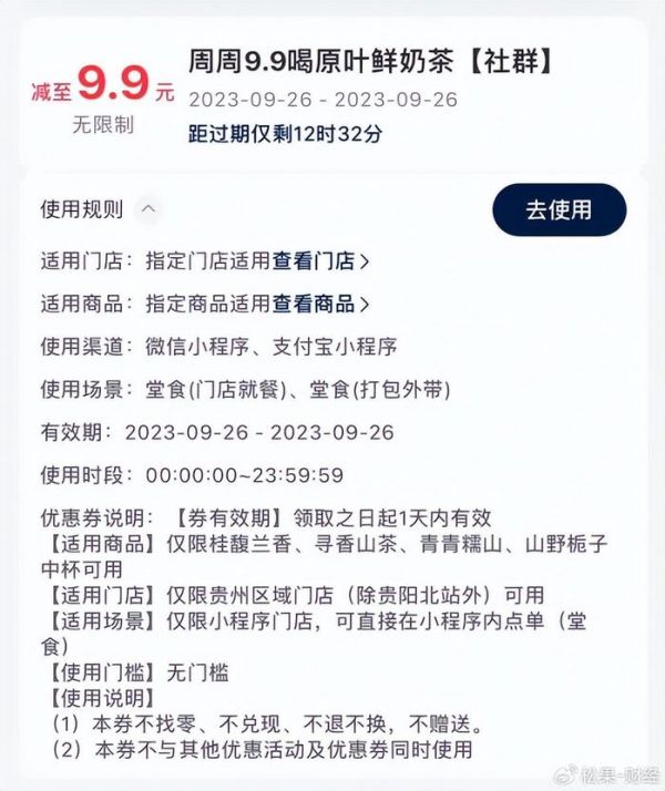 以霸王茶姬的9.9原叶鲜奶茶优惠券为例,其在社群发放后,要求堂食并且24小时内通过品牌小程序使用,不仅带动了线下门店的客流,还缩短了消费者兑换履约的链路,避免了囤货心理,让即领即买变成一种习惯。此外,9.9领券往往还需要注册成为品牌会员,而非像部分咖啡品牌一样,可以在直播渠道不记名囤券。