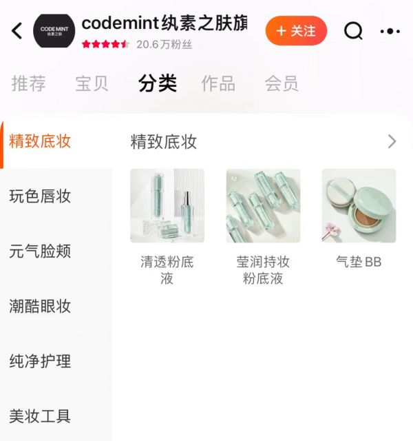 根据CODEMINT旗舰店显示,品牌的品类大致包括底妆、唇妆、高光腮红、眼妆、面膜卸妆和美妆工具等,也就是说分为彩妆、护肤和美妆工具三类,它的“纯净”主要是基于成分和配方。