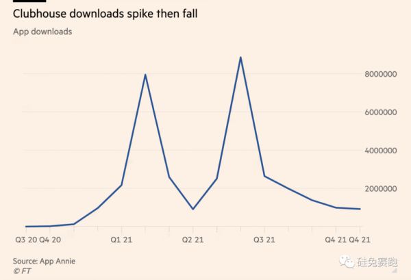 面对着多个Clubhouse复制款的强势来袭,Clubhouse自身的城墙也开始出现裂缝,比如大批涌入的用户导致app时常宕机,平台上的语音聊天常常出现虚假信息和极端言论,而Clubhouse对其无能为力也毫不作为,这些都成为了Clubhouse的软肋,到2021年下半年时它的增长明显放缓,据App Annie的数据显示,在6月时它的下载数达到了900万的高峰,而在11月时这一数字仅有92万了。