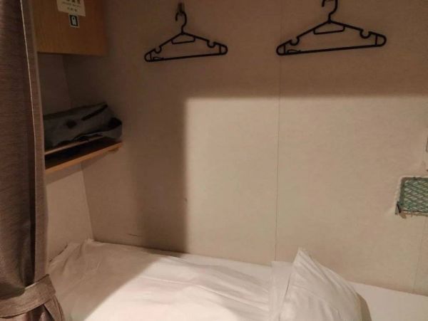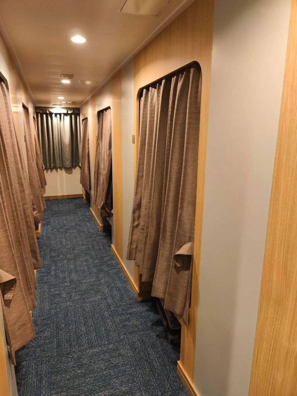 其实就是拉帘的一张床位,床下可以放行李,好处是没有上下铺,经济舱貌似是有上下铺的,但是看介绍貌似是错层模式,没有体验,不做点评。舒适舱的价格是7000多日元,我加了餐饮服务(晚饭和早饭两顿自助餐)是1万日元。那么因为我不吃生鱼片,感觉这个餐饮服务买的略显不值。
